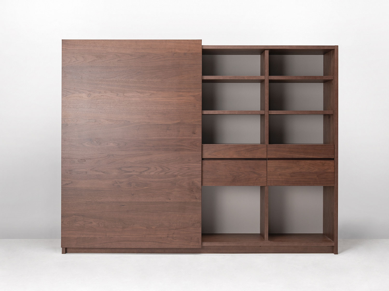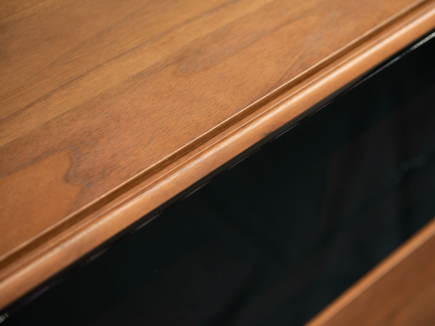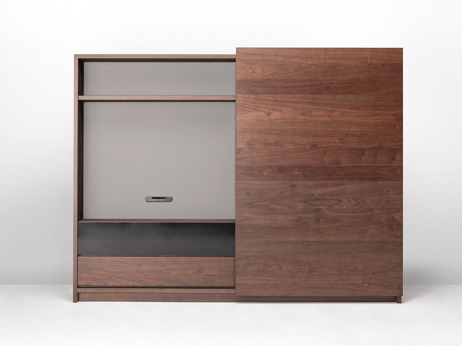 大型の扉をスライドさせることで、「見せる」と「隠す」を使い分けるキャビネット。ふだんは木質感あふれる飾り棚や書棚として使え、無機質なTVを隠して落ち着いた空間を演出します。扉は片手で軽く引くと、吸い付くように収まる仕様です。