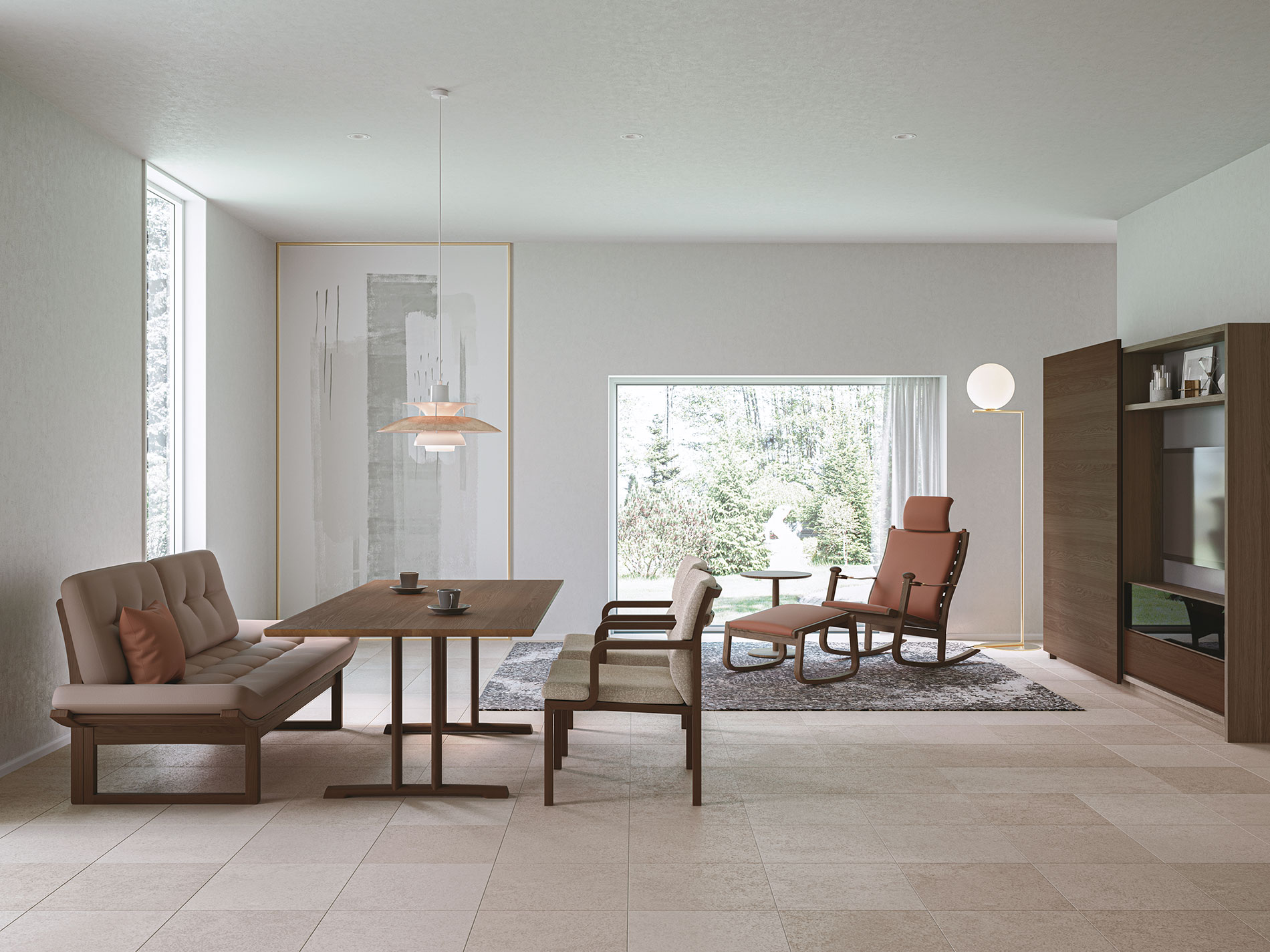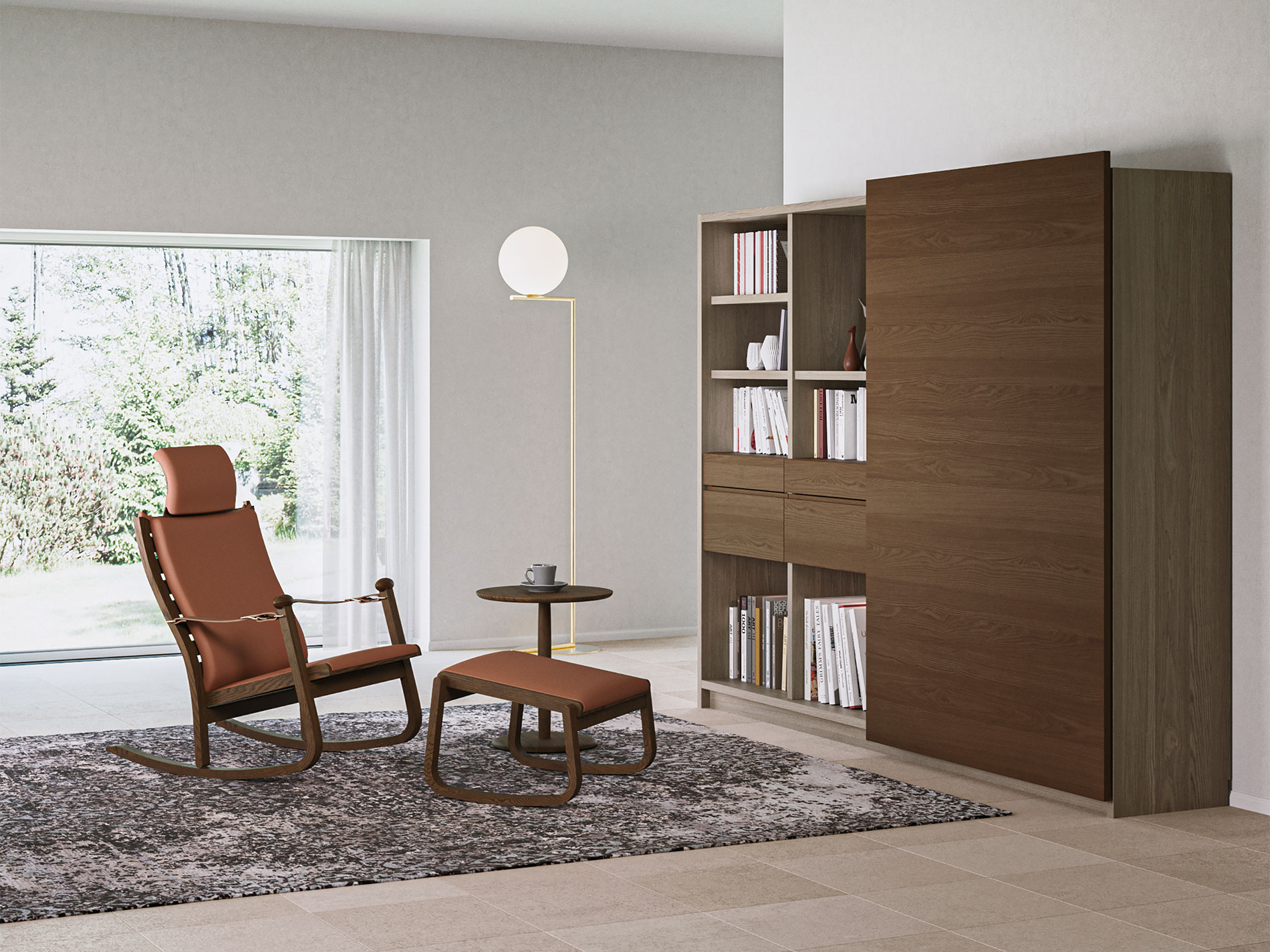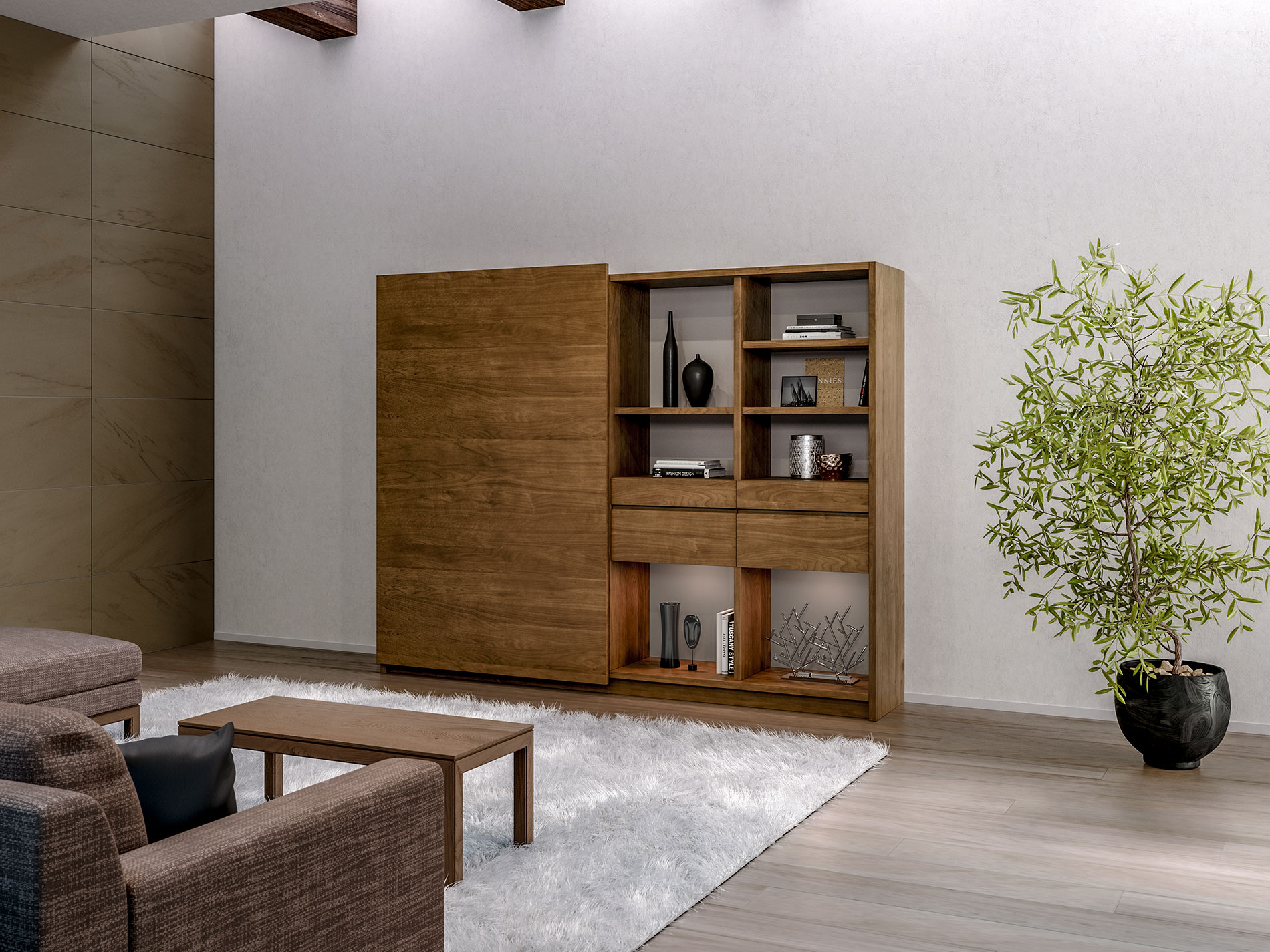 大型の扉をスライドさせることで、「見せる」と「隠す」を使い分けるキャビネット。ふだんは木質感あふれる飾り棚や書棚として使え、無機質なTVを隠して落ち着いた空間を演出します。扉は片手で軽く引くと、吸い付くように収まる仕様です。