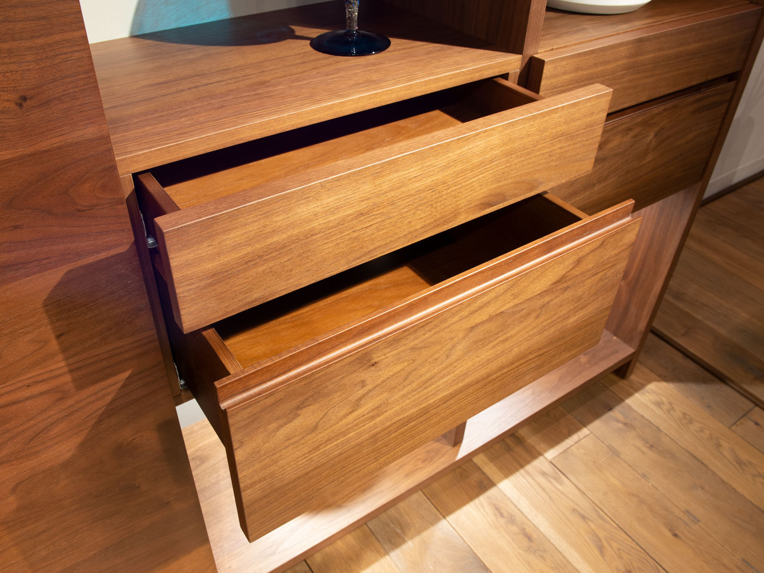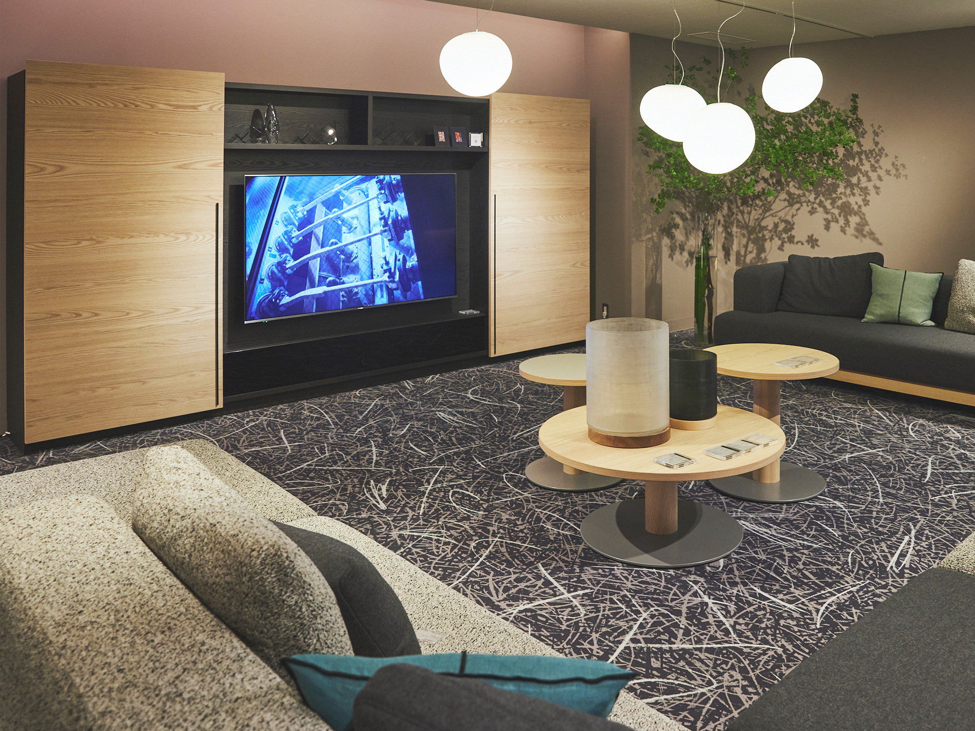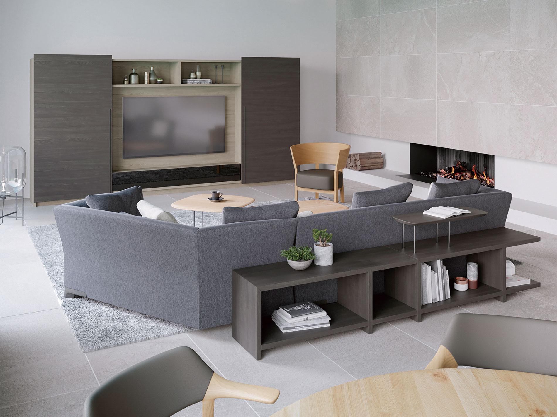 大型の扉をスライドさせることで、「見せる」と「隠す」を使い分けるキャビネット。ふだんは木質感あふれる飾り棚や書棚として使え、無機質なTVを隠して落ち着いた空間を演出します。扉は片手で軽く引くと、吸い付くように収まる仕様です。