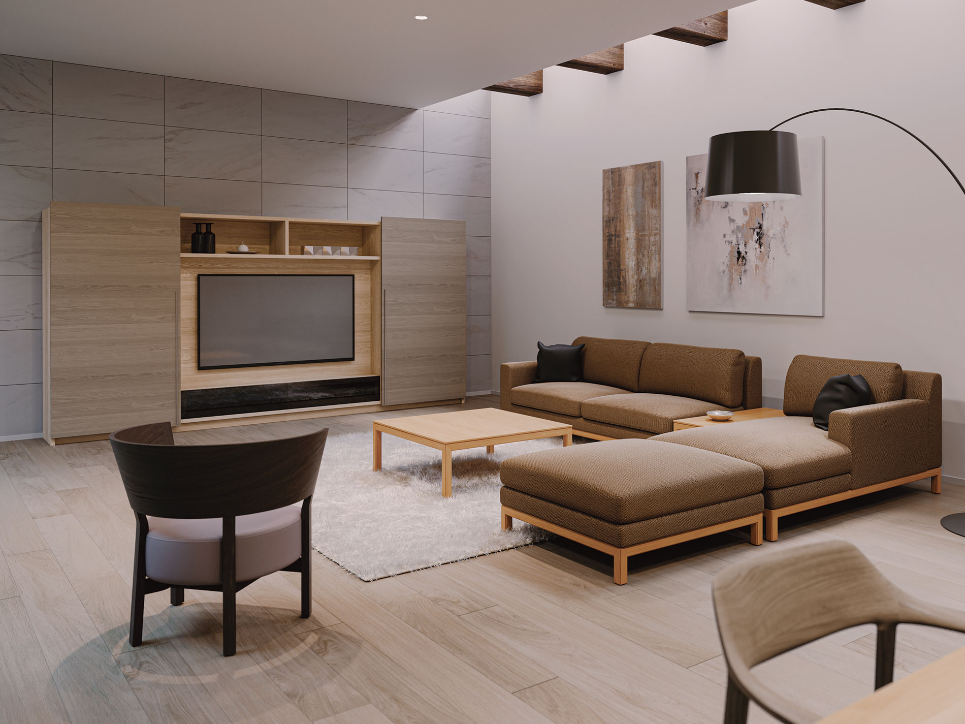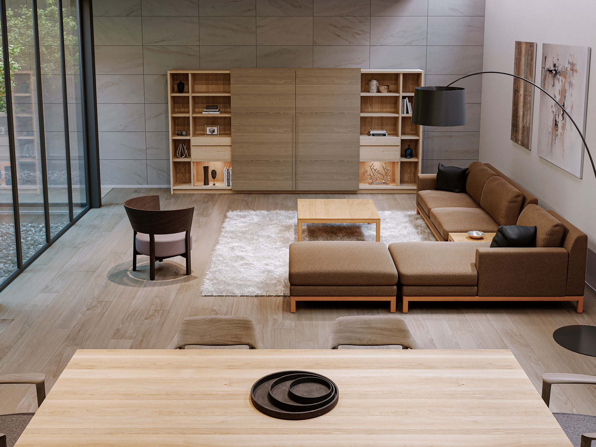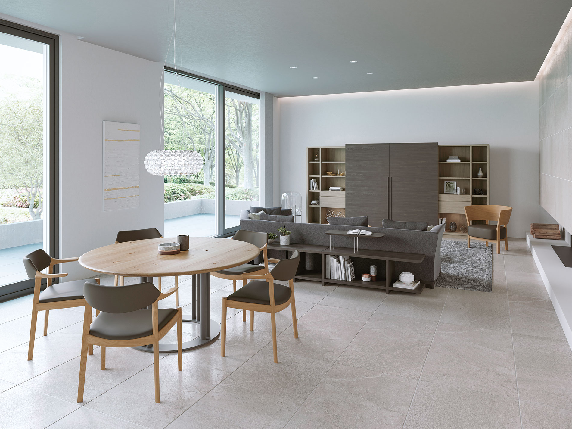 大型の扉をスライドさせることで、「見せる」と「隠す」を使い分けるキャビネット。ふだんは木質感あふれる飾り棚や書棚として使え、無機質なTVを隠して落ち着いた空間を演出します。扉は片手で軽く引くと、吸い付くように収まる仕様です。