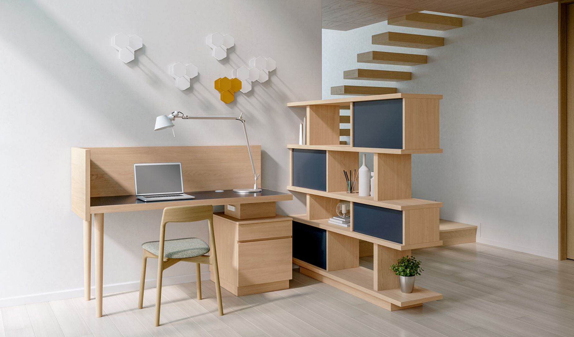 ホームオフィスなどにおすすめしたいデスクタイプのプランです。天板にはもの書きにも程よい弾力性を持つ天然素材のリノリウムを採用するなど、快適で安全な作業環境づくりを追求しました。