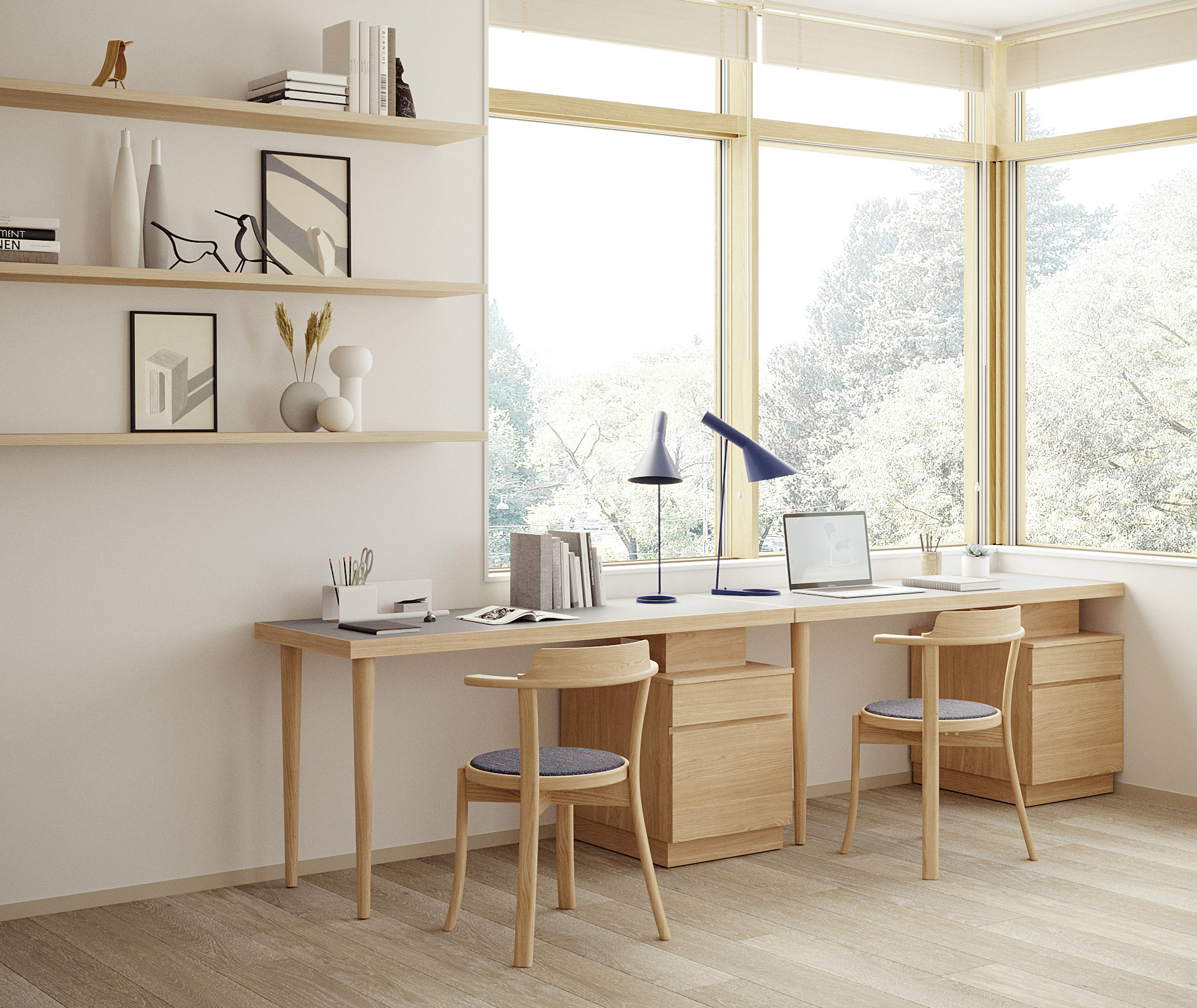 ホームオフィスなどにおすすめしたいデスクタイプのプランです。天板にはもの書きにも程よい弾力性を持つ天然素材のリノリウムを採用するなど、快適で安全な作業環境づくりを追求しました。