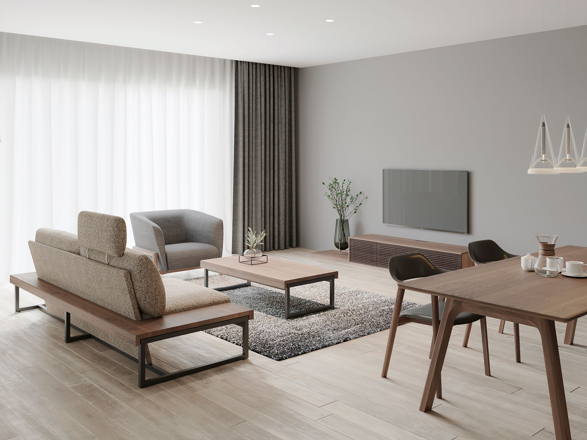 TVボードは、30mmの台輪と15mmの天板で、ミニマルな存在感の組み合わせもご用意。カラー塗装を施した天板と木質感を生かした扉とのコントラストが個性的なプランなど、選択の幅も豊富です。
