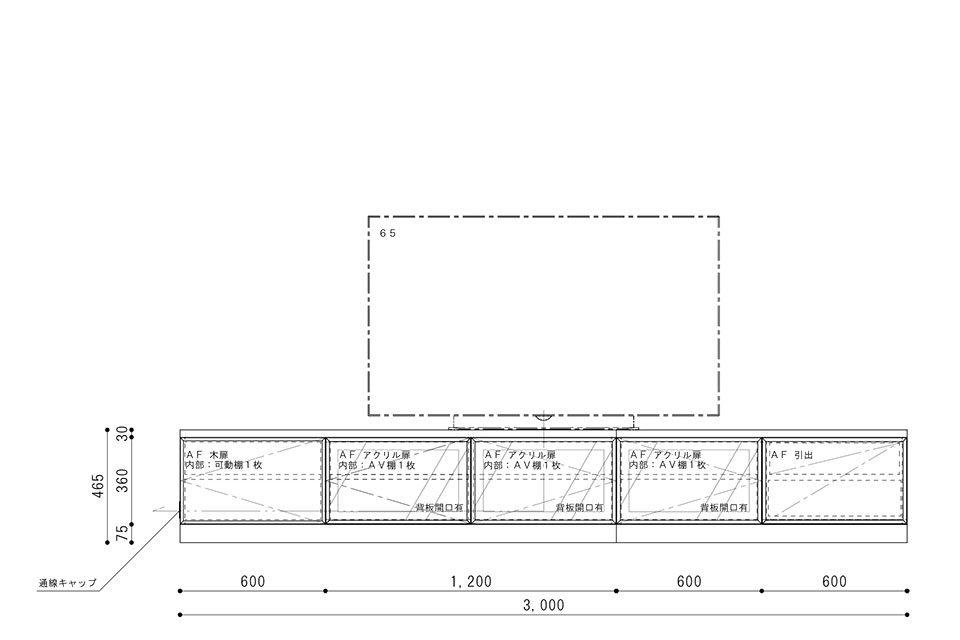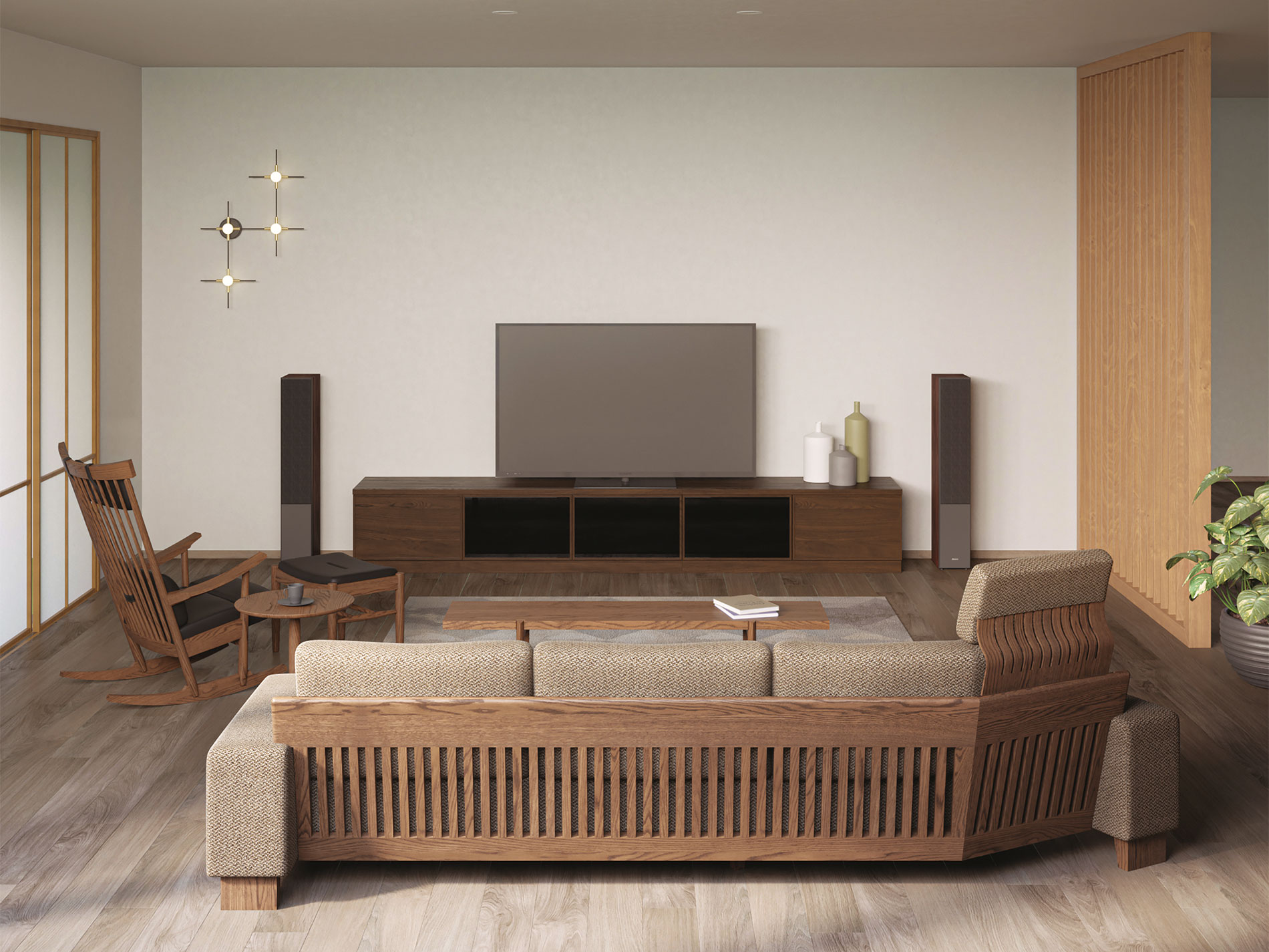 TVボードは、30mmの台輪と15mmの天板で、ミニマルな存在感の組み合わせもご用意。カラー塗装を施した天板と木質感を生かした扉とのコントラストが個性的なプランなど、選択の幅も豊富です。