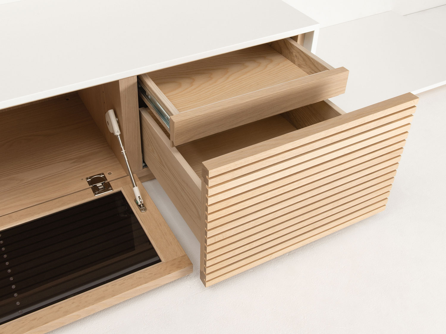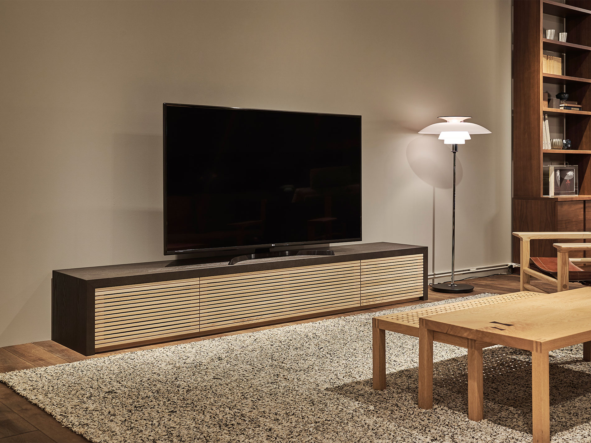 TVボードは、30mmの台輪と15mmの天板で、ミニマルな存在感の組み合わせもご用意。カラー塗装を施した天板と木質感を生かした扉とのコントラストが個性的なプランなど、選択の幅も豊富です。