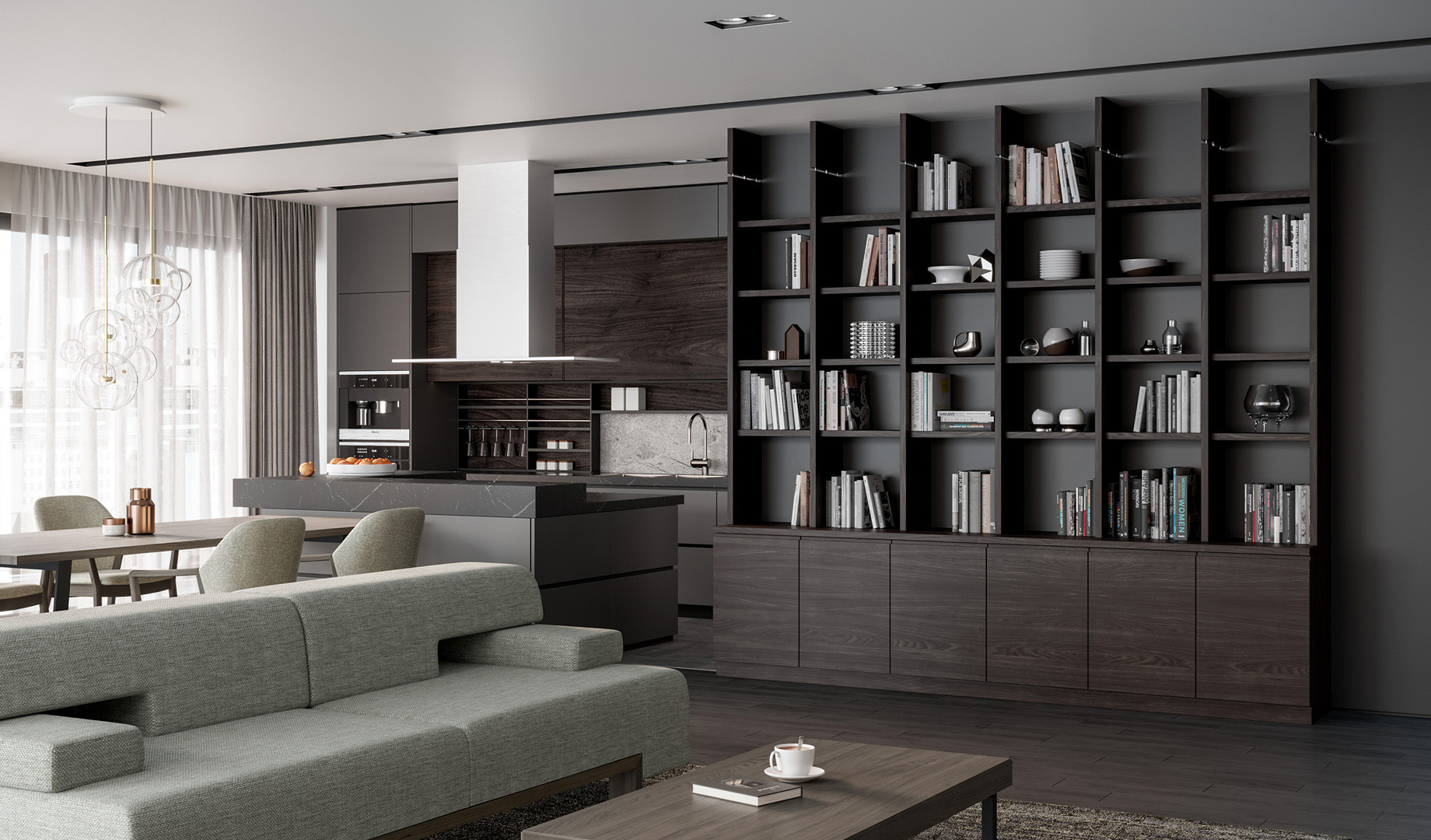 多くの本の収納やディスプレイ棚としても使用できるオープンシェルフと、扉付きの収納部が一体化した大型書棚。手掛けのないプッシュラッチ式の木扉においては、横に伸びる木目の美しさが際立ちます。