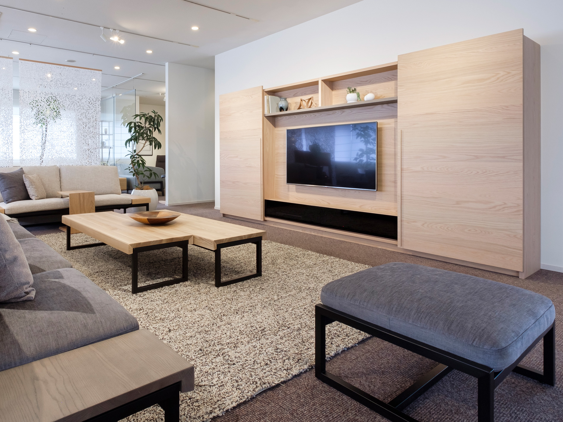 大型の扉をスライドさせることで、「見せる」と「隠す」を使い分けるキャビネット。ふだんは木質感あふれる飾り棚や書棚として使え、無機質なTVを隠して落ち着いた空間を演出します。扉は片手で軽く引くと、吸い付くように収まる仕様です。