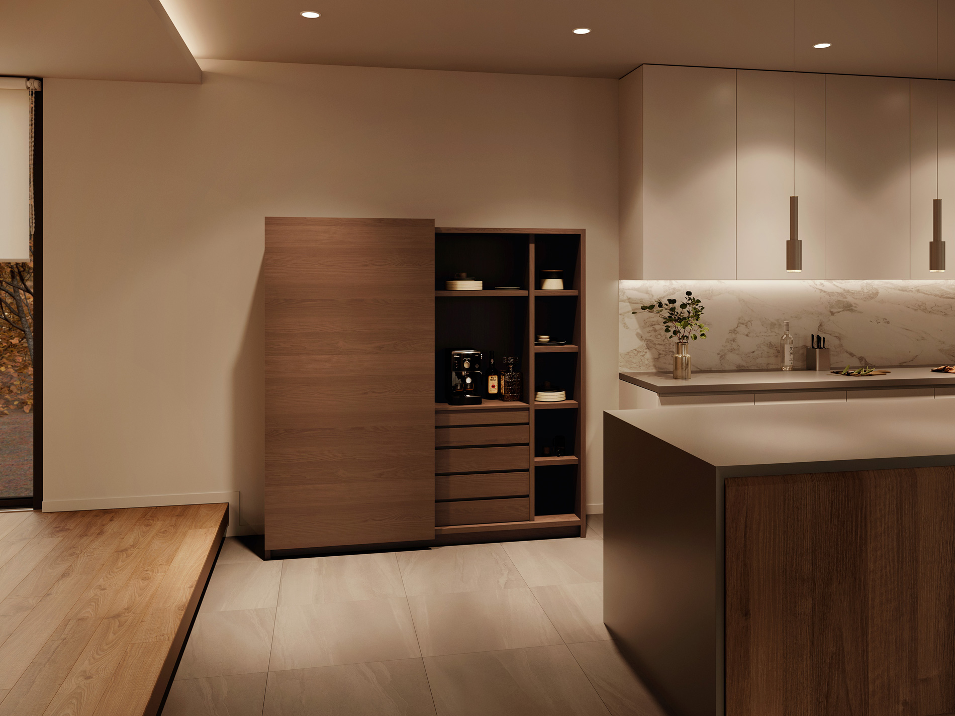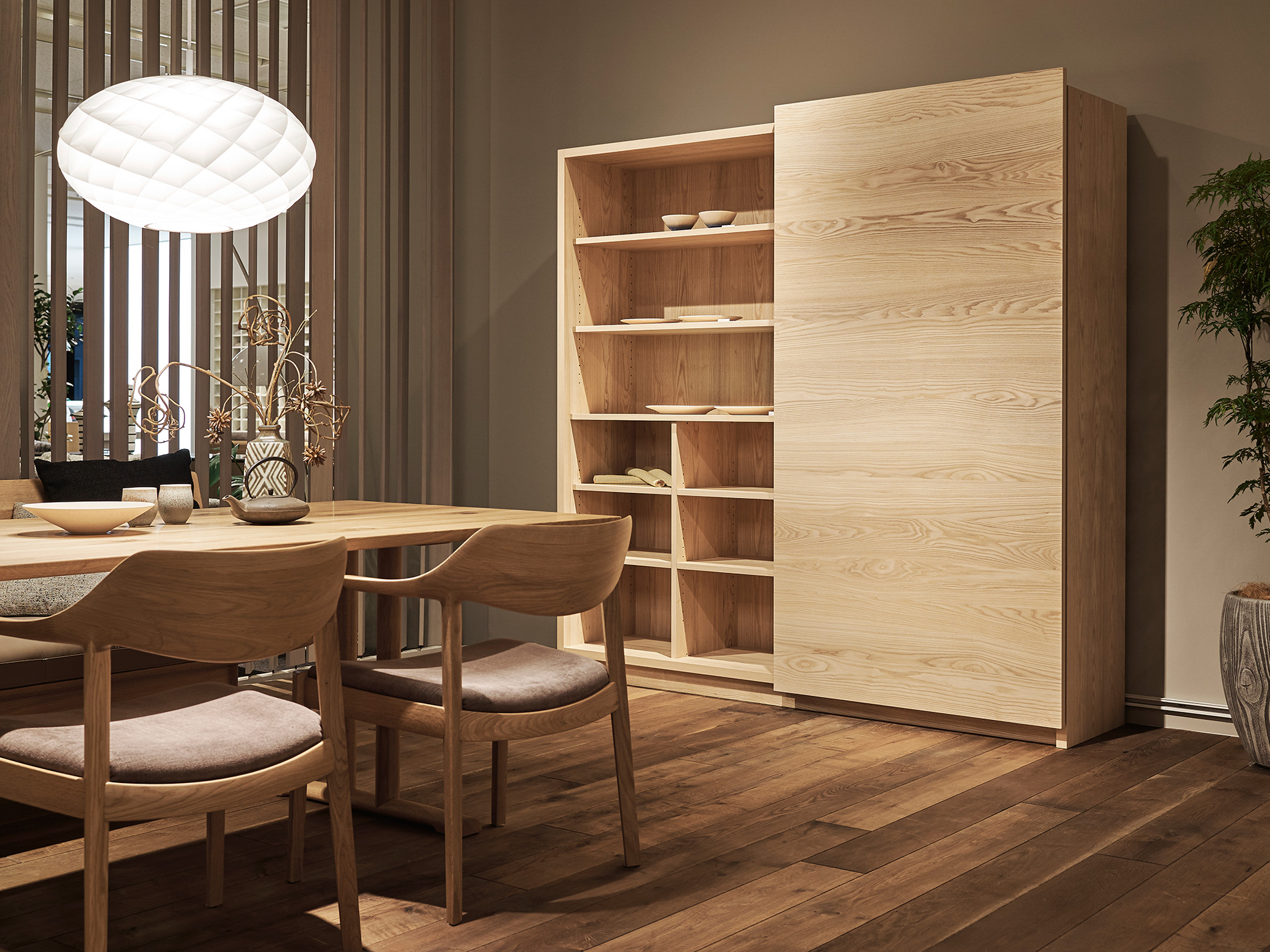 大型の扉をスライドさせることで、「見せる」と「隠す」を使い分けるキャビネット。ふだんは木質感あふれる飾り棚や書棚として使え、無機質なTVを隠して落ち着いた空間を演出します。扉は片手で軽く引くと、吸い付くように収まる仕様です。