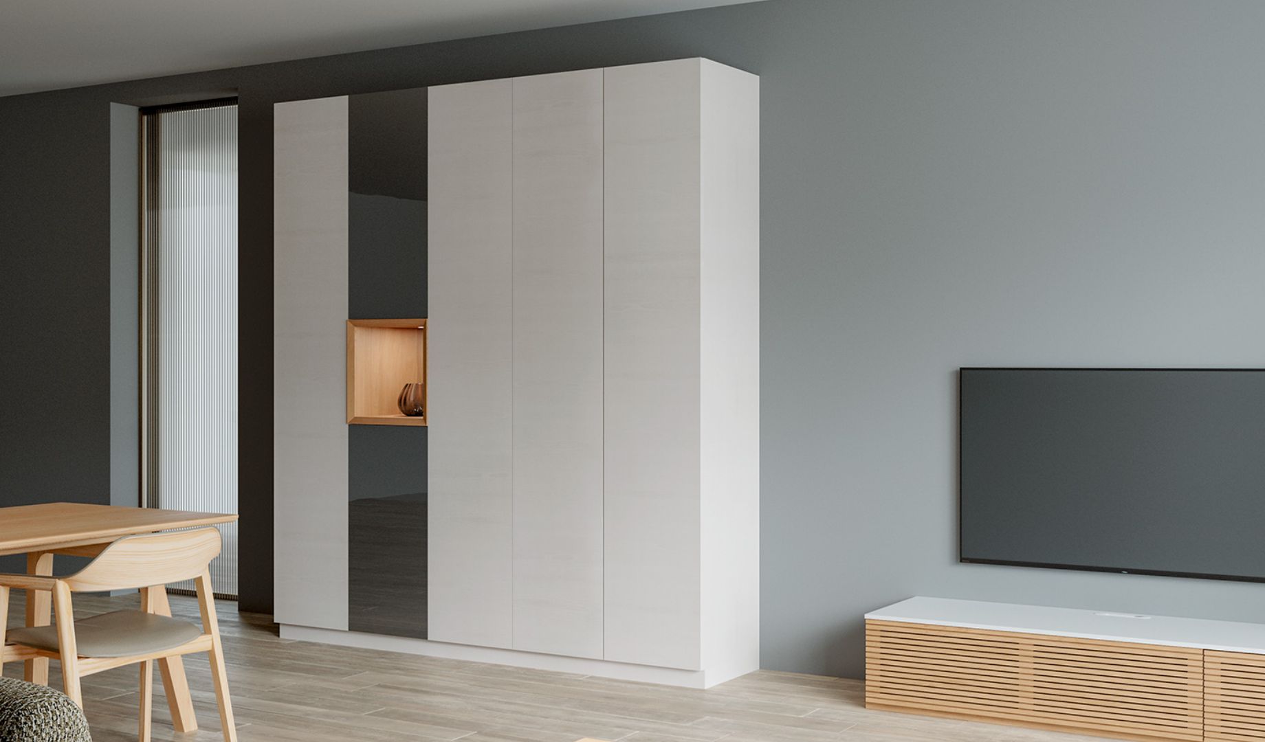 天井高に近い高さの大型キャビネット。プッシュラッチ式で手掛けのない高さ2.4mの一枚扉が、静謐な佇まいを演出します。ダウンライトを組み込んだニッチは、フレームの仕上げにもこだわりました。