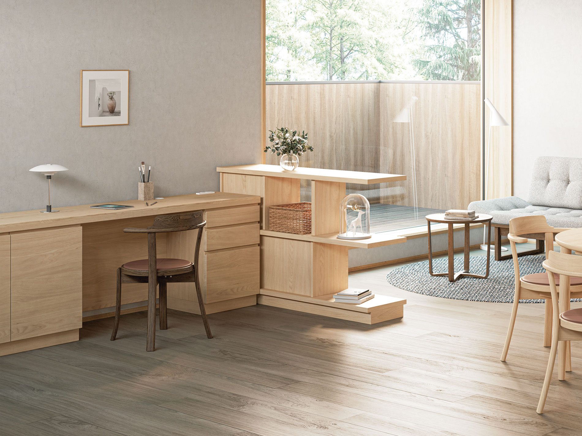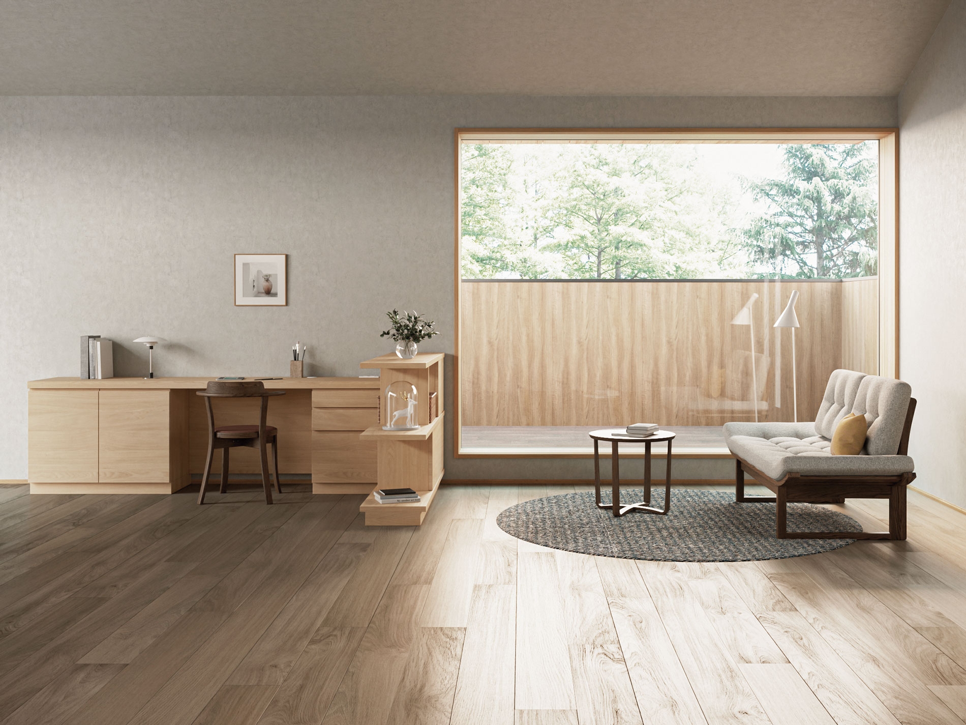 ホームオフィスなどにおすすめしたいデスクタイプのプランです。天板にはもの書きにも程よい弾力性を持つ天然素材のリノリウムを採用するなど、快適で安全な作業環境づくりを追求しました。