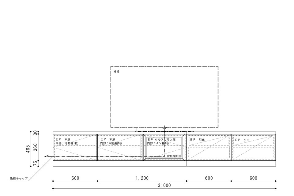TVボードは、30mmの台輪と15mmの天板で、ミニマルな存在感の組み合わせもご用意。カラー塗装を施した天板と木質感を生かした扉とのコントラストが個性的なプランなど、選択の幅も豊富です。