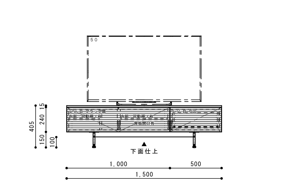 TVボードは、30mmの台輪と15mmの天板で、ミニマルな存在感の組み合わせもご用意。カラー塗装を施した天板と木質感を生かした扉とのコントラストが個性的なプランなど、選択の幅も豊富です。