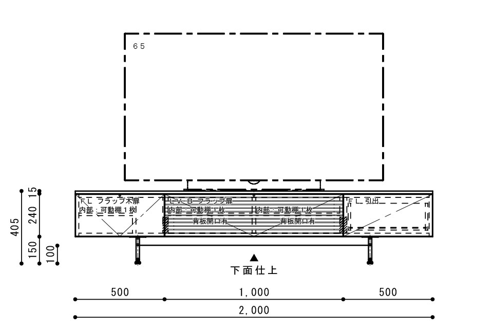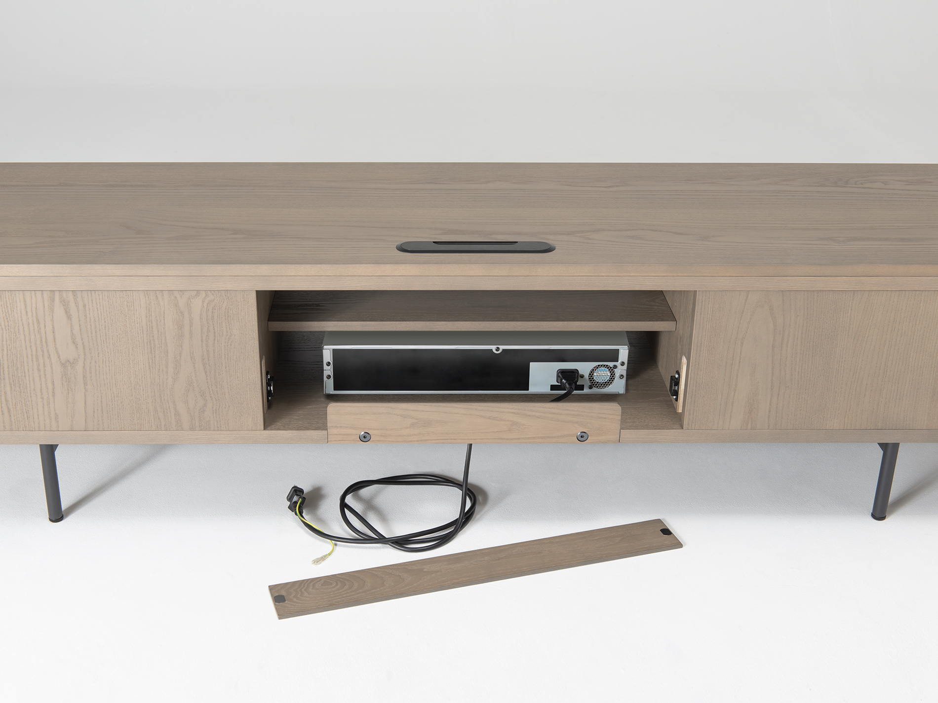 TVボードは、30mmの台輪と15mmの天板で、ミニマルな存在感の組み合わせもご用意。カラー塗装を施した天板と木質感を生かした扉とのコントラストが個性的なプランなど、選択の幅も豊富です。