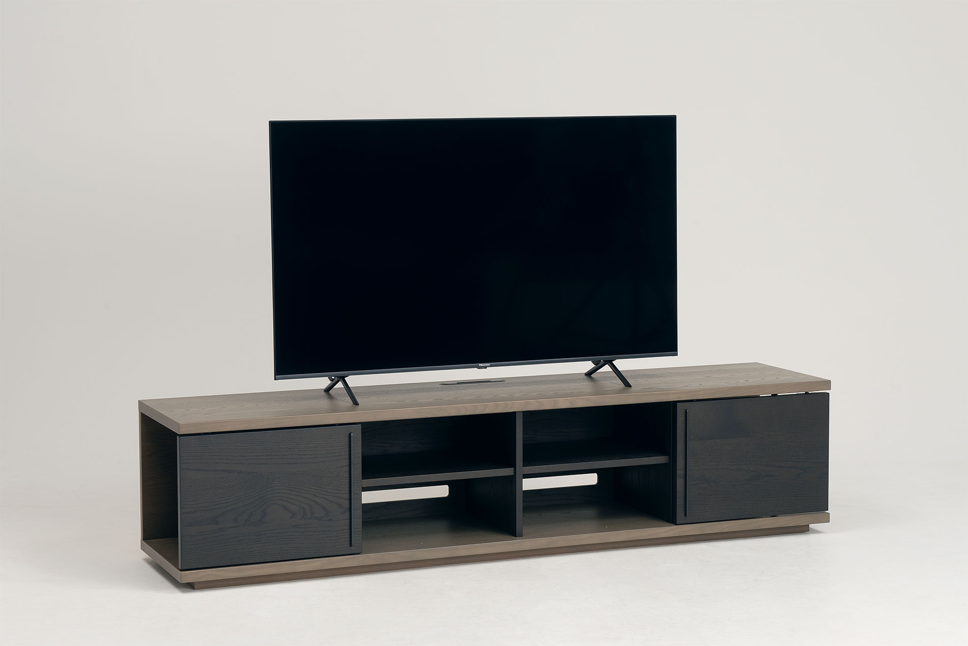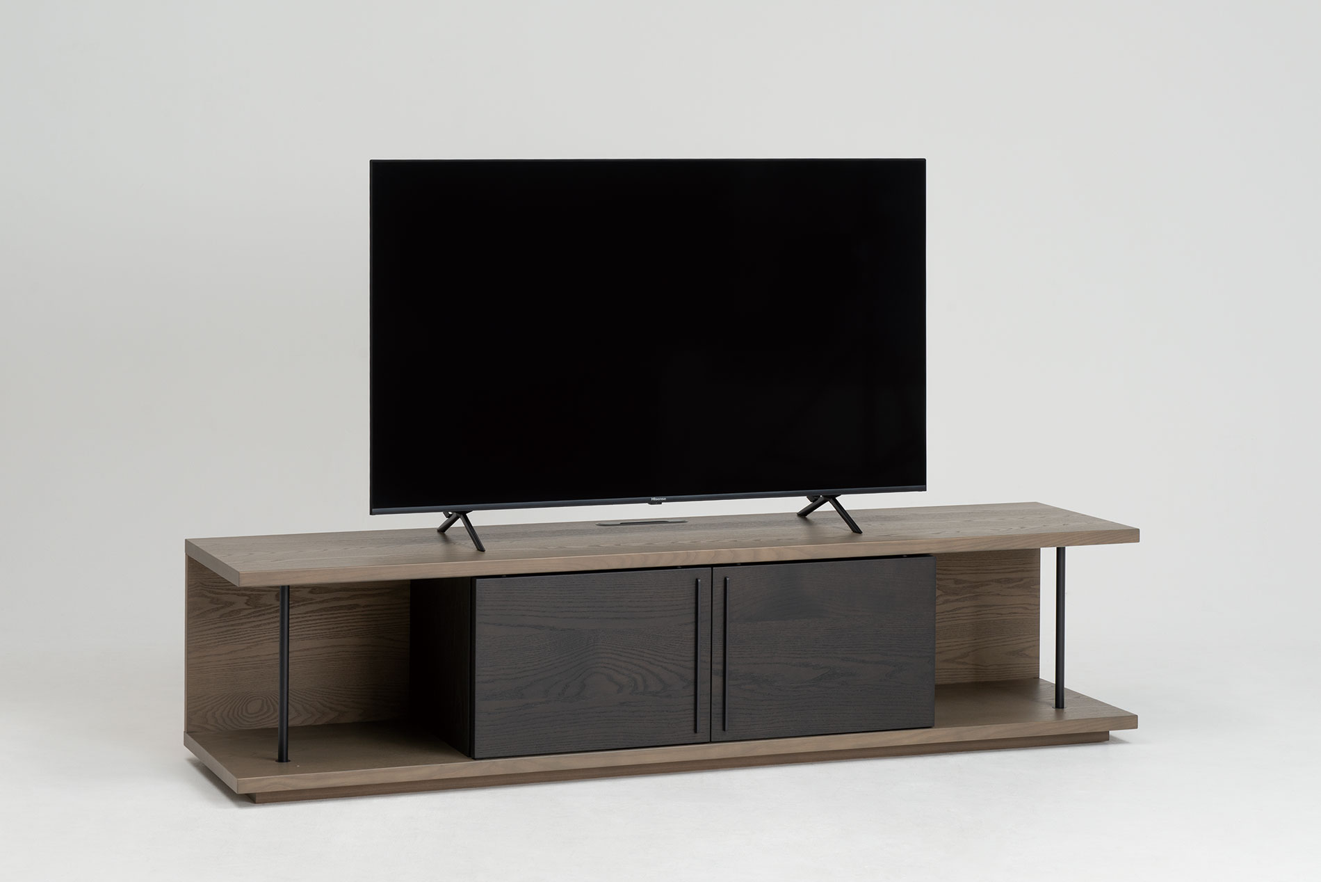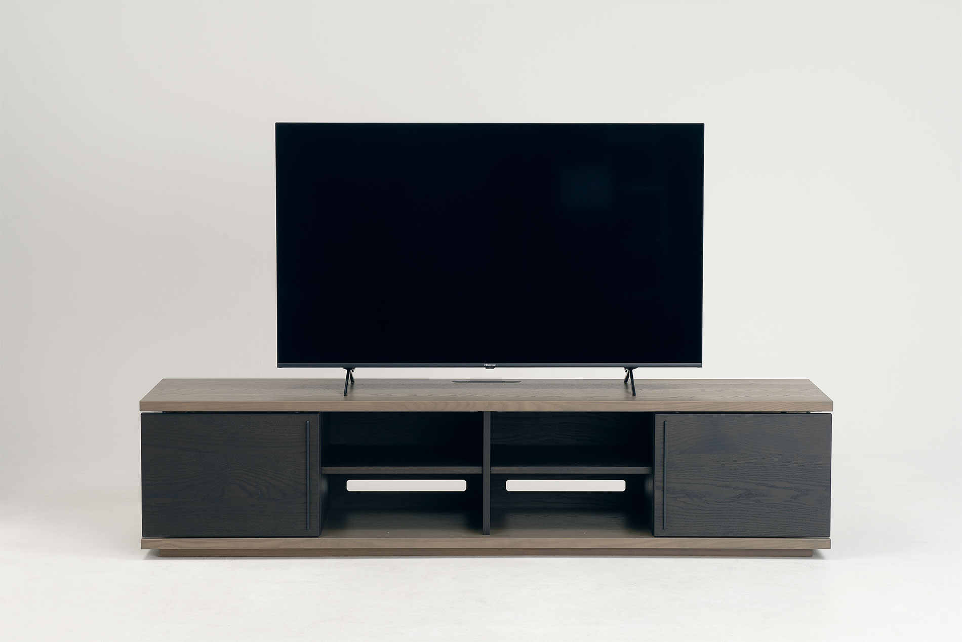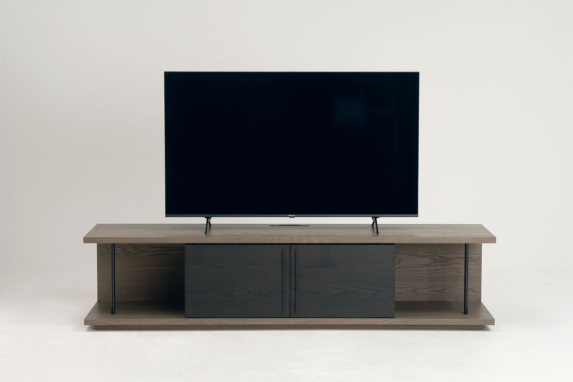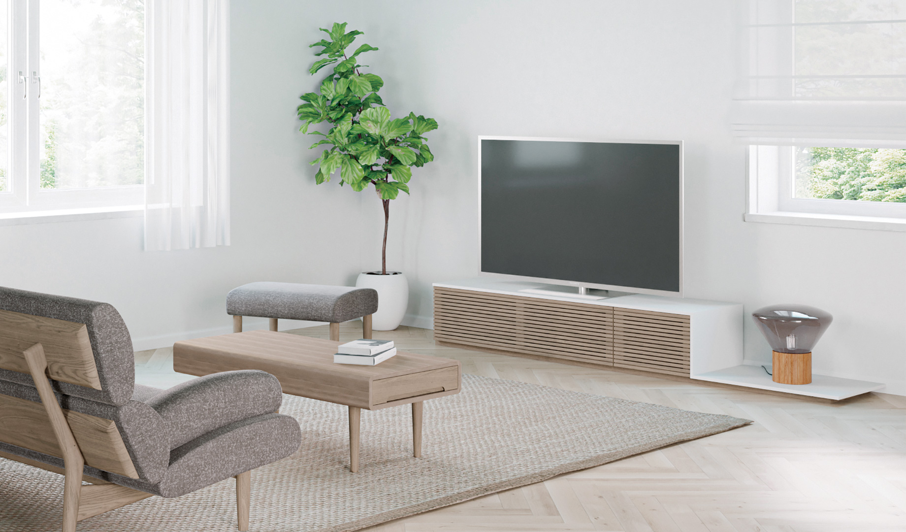 TVボードは、30mmの台輪と15mmの天板で、ミニマルな存在感の組み合わせもご用意。カラー塗装を施した天板と木質感を生かした扉とのコントラストが個性的なプランなど、選択の幅も豊富です。