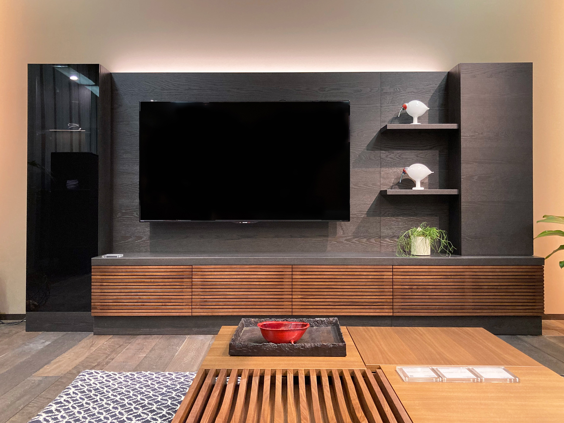 空間にアクセントを加えるリビングボード。こまやかな仕上げのルーバー扉や伝統技法を生かした「うづくり」仕上げ、高さ120mmの台輪など、上質感を高める仕様があちこちに。
