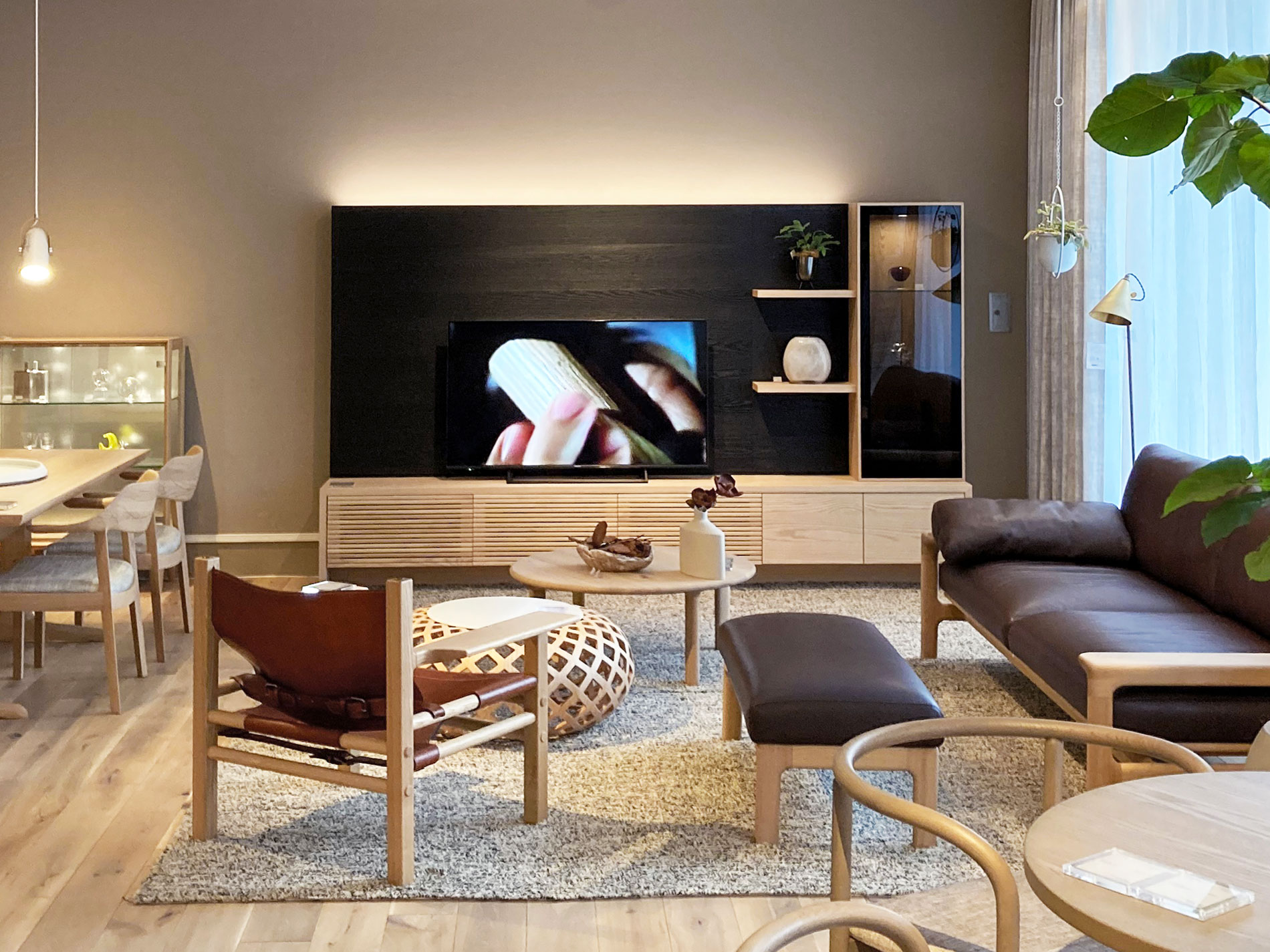 空間にアクセントを加えるリビングボード。こまやかな仕上げのルーバー扉や伝統技法を生かした「うづくり」仕上げ、高さ120mmの台輪など、上質感を高める仕様があちこちに。