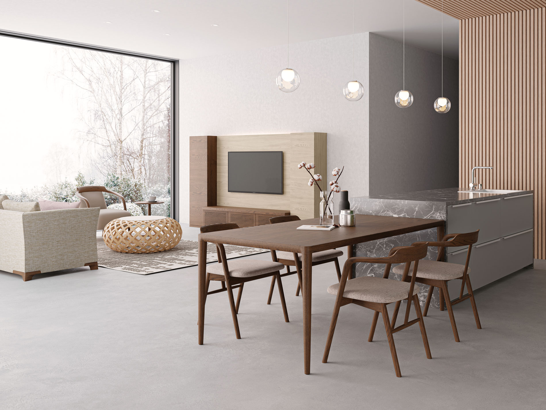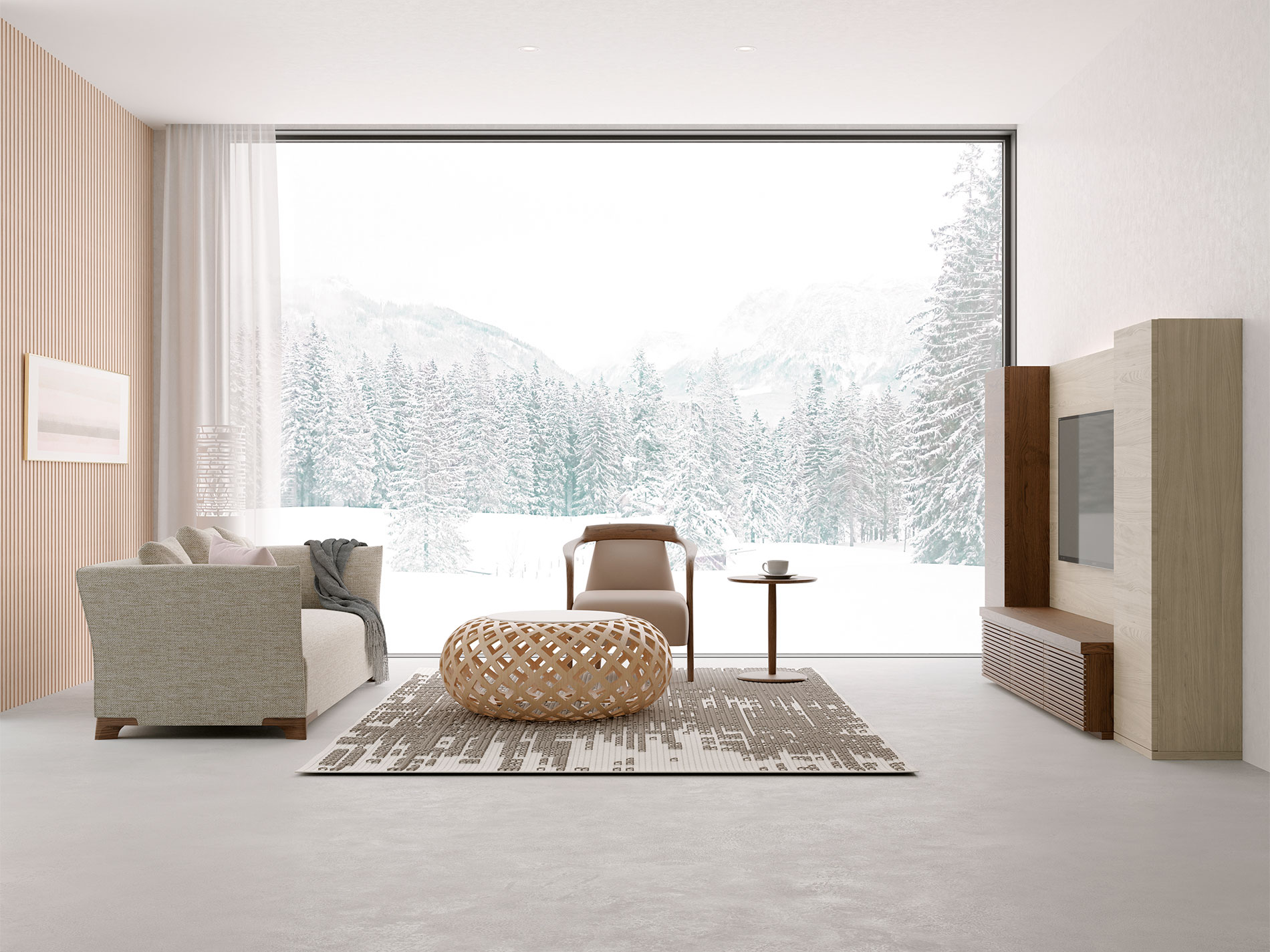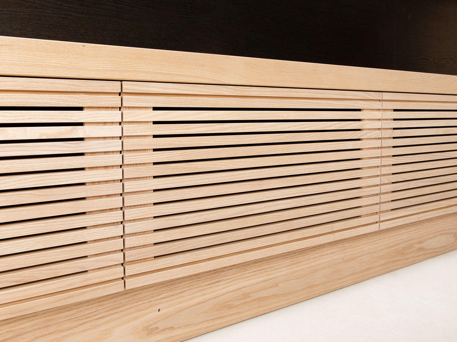 空間にアクセントを加えるリビングボード。こまやかな仕上げのルーバー扉や伝統技法を生かした「うづくり」仕上げ、高さ120mmの台輪など、上質感を高める仕様があちこちに。